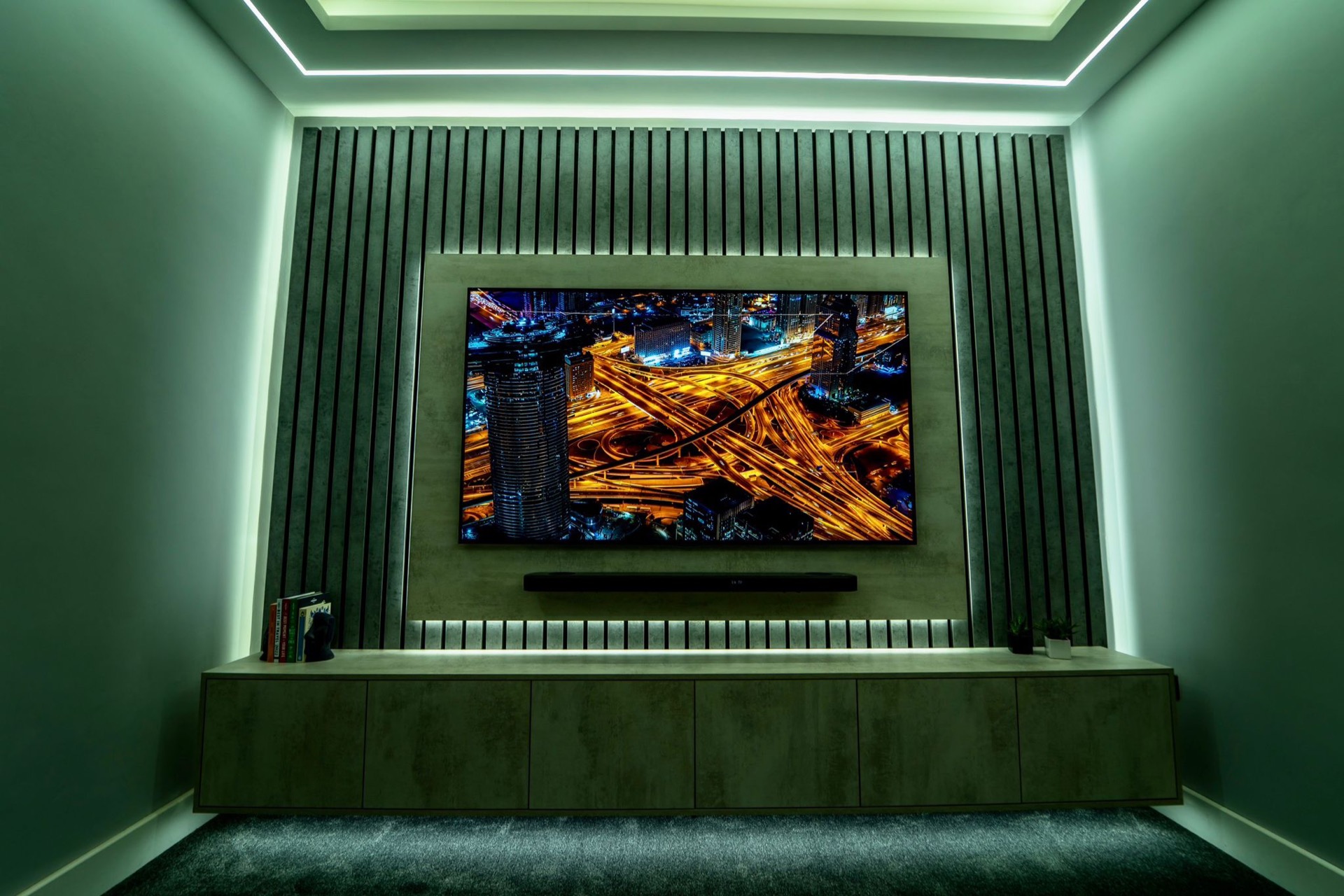 The interior is a stylised and dynamic clutter-free space that is a forward-thinking, contemporary luxury space that maximises spatial use, cutting edge design and technology. To define the bare spaces we conceptualised a black and white colour pallet as the base and being creative with textures, creating a feature panelled wall and LED recessed lighting around the ceiling to create a homely ambience.